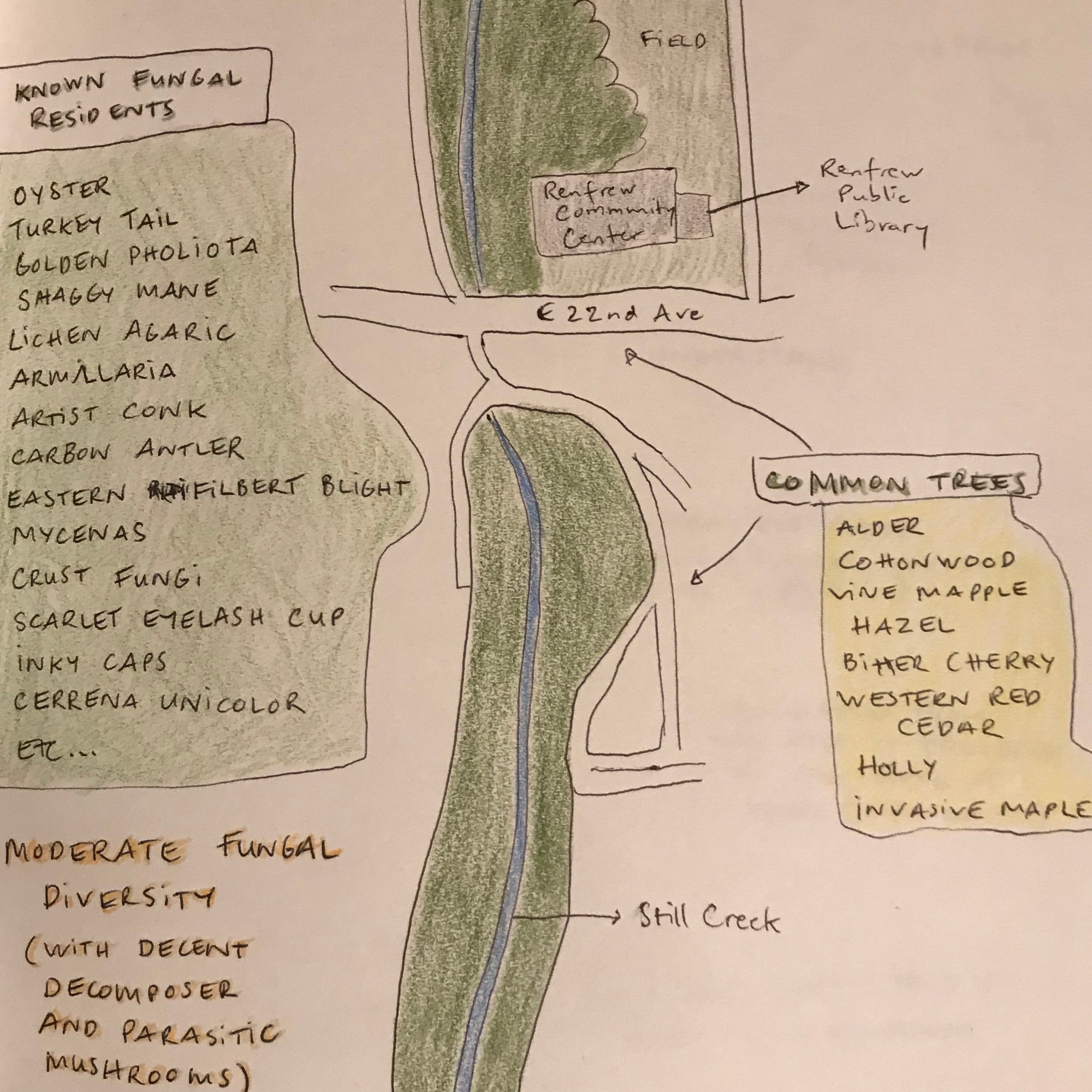Facilitated by artists Willoughby Arevalo & Isabelle Kirouac, in collaboration with the Collingwood Neighborhood House, Walking the Mycelial Web is a series of artistic activities inspired by ecology and fungal life, taking place primarily outdoors in three parks of the Renfrew-Collingwood neighborhood, each representing a different ecosystem: Renfrew Ravine Park, a wild but disturbed ravine; Gaston Park, a grassy field surrounded by street trees; and Cariboo Park, a small park with a pond and lively tree and fungal diversity.